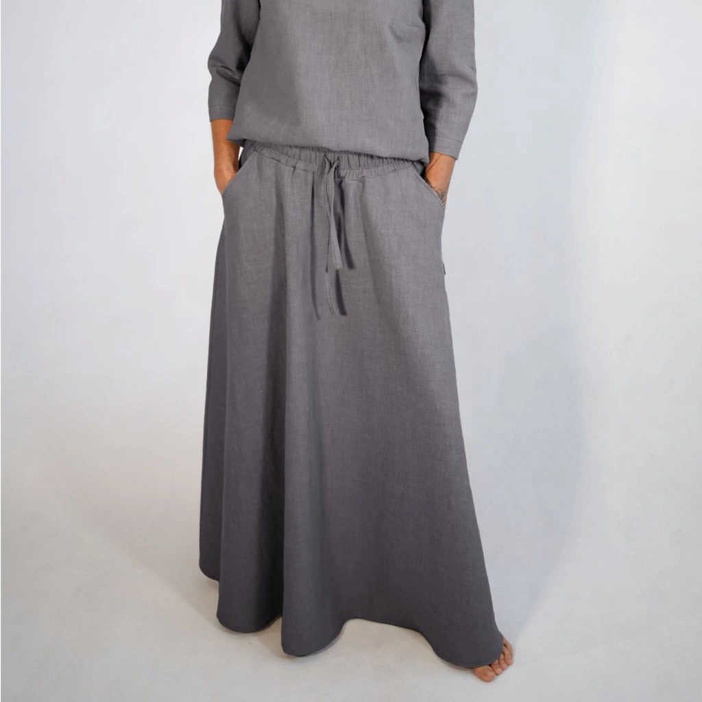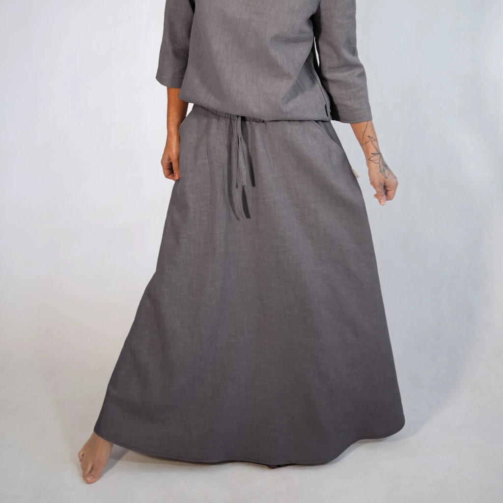 Každú sukňu šijeme v našej lokálnej dielni s dôrazom na detaily, ktoré vydržia sezóny. Zmes 80 % ľanu a 20 % bavlny je ideálnou voľbou – ľan prináša prirodzený chlad a antibakteriálne vlastnosti, bavlna dodáva jemnosť, ktorú oceníte pri celodennom nosení.