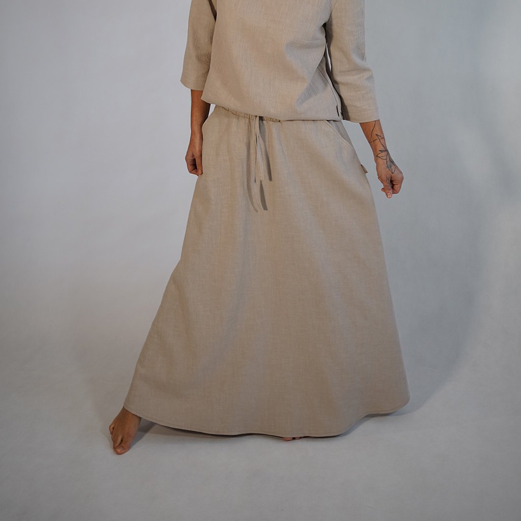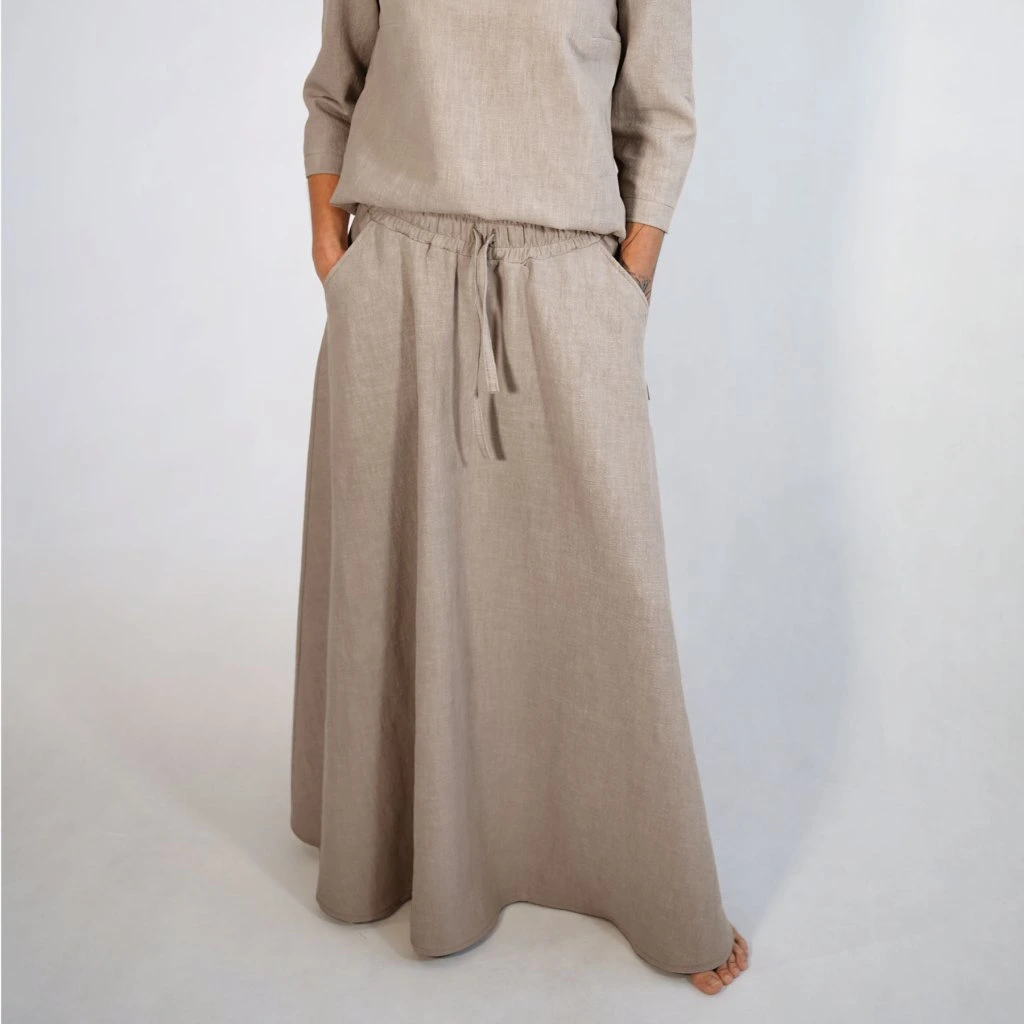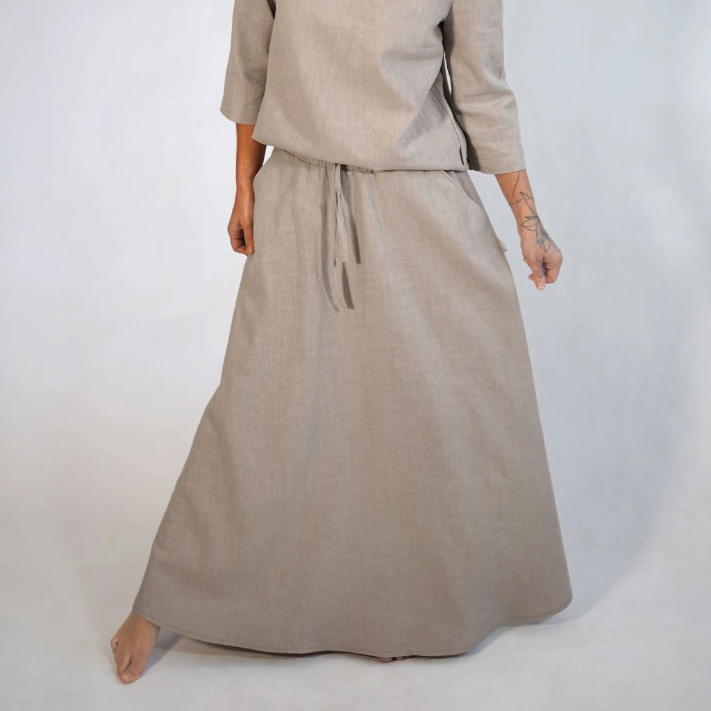 Každú sukňu šijeme v našej lokálnej dielni s dôrazom na detaily, ktoré vydržia sezóny. Zmes 80 % ľanu a 20 % bavlny je ideálnou voľbou – ľan prináša prirodzený chlad a antibakteriálne vlastnosti, bavlna dodáva jemnosť, ktorú oceníte pri celodennom nosení.