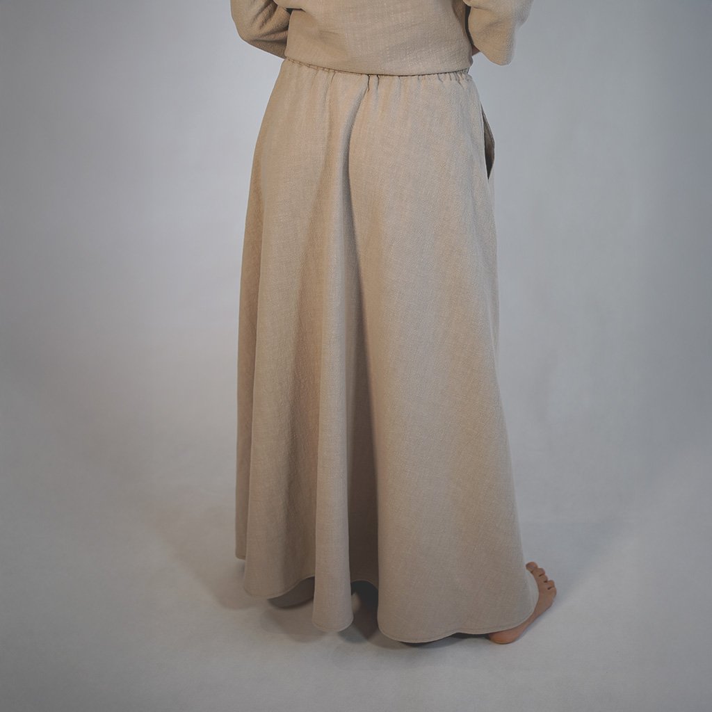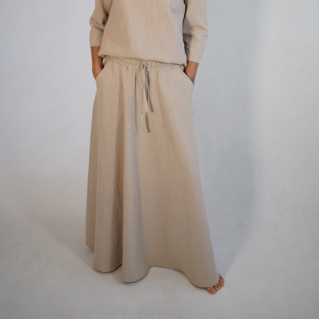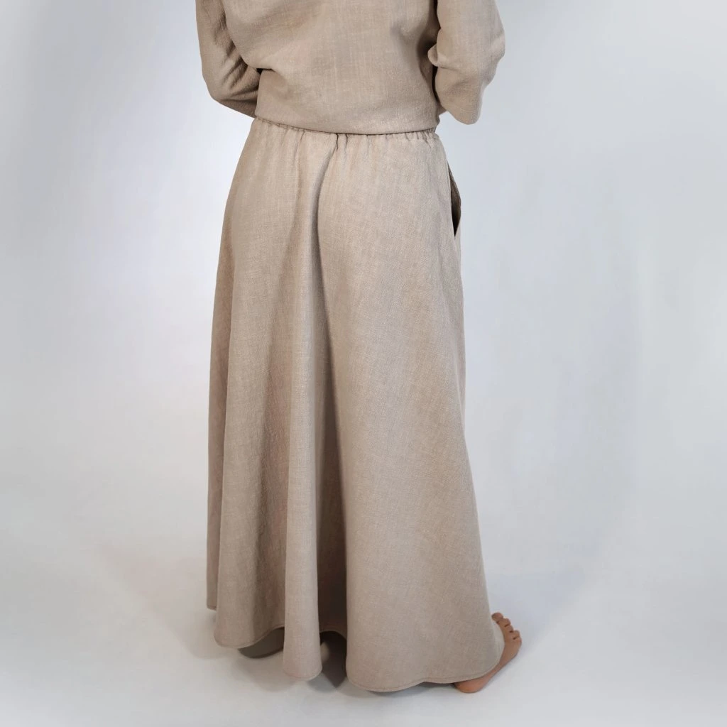 Každú sukňu šijeme v našej lokálnej dielni s dôrazom na detaily, ktoré vydržia sezóny. Zmes 80 % ľanu a 20 % bavlny je ideálnou voľbou – ľan prináša prirodzený chlad a antibakteriálne vlastnosti, bavlna dodáva jemnosť, ktorú oceníte pri celodennom nosení.