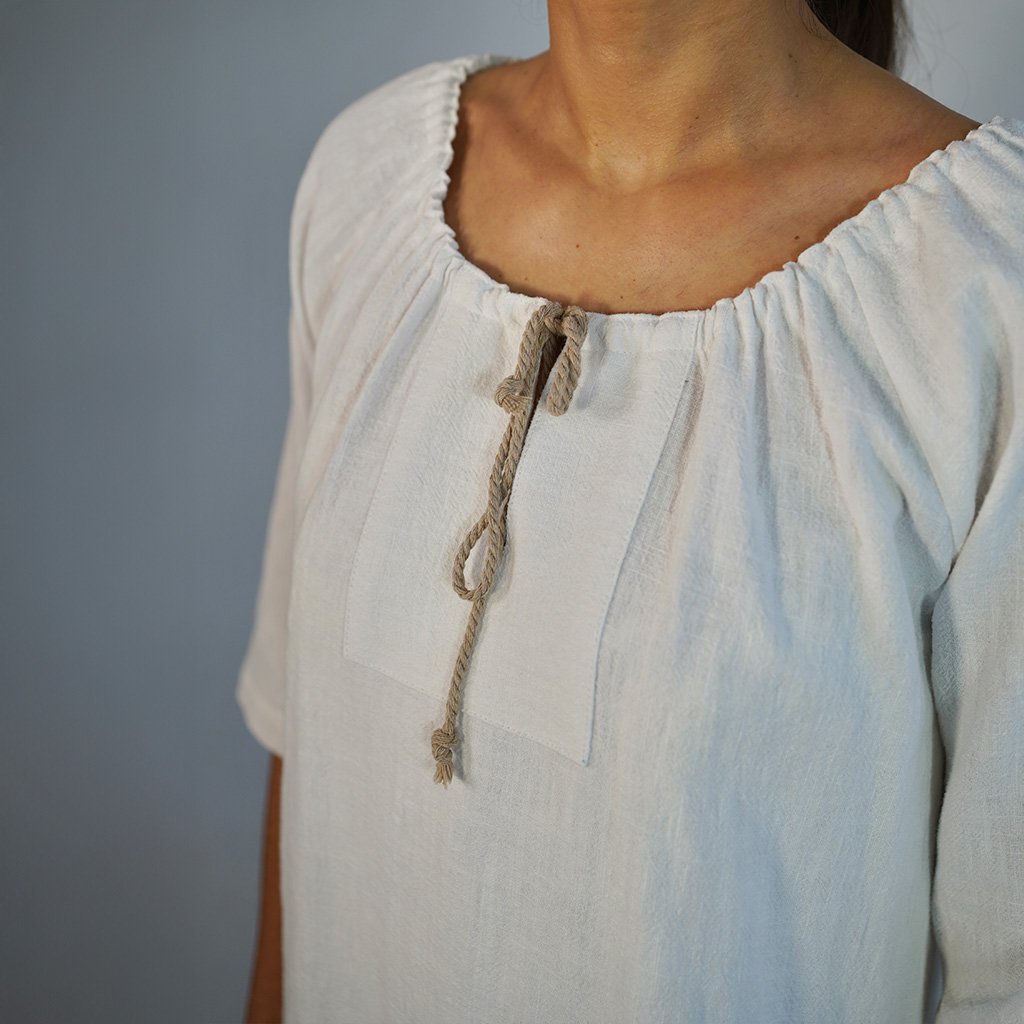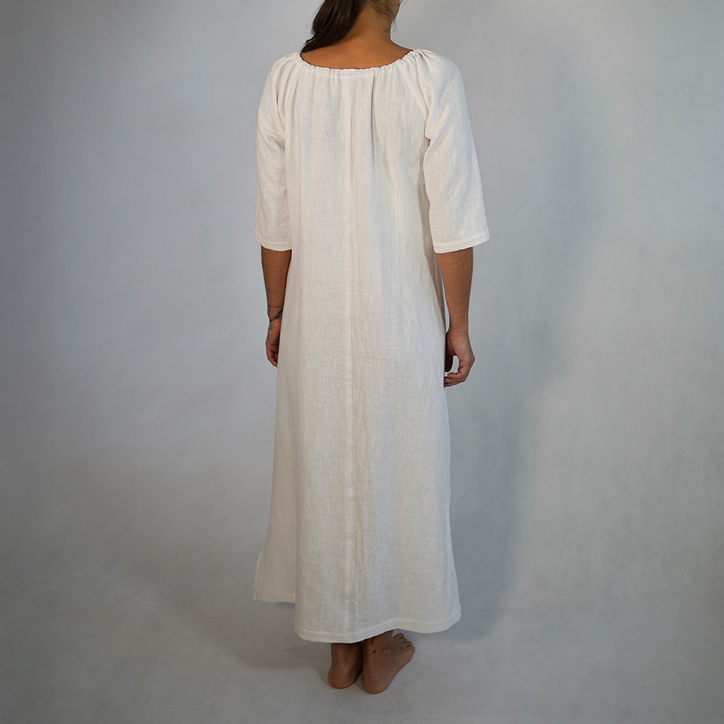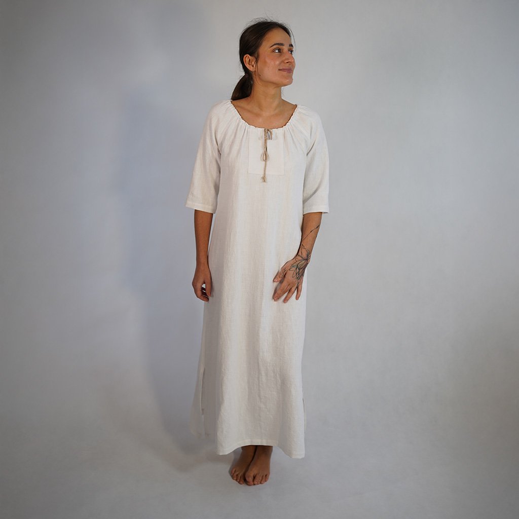 Šaty LEYLA vznikajú v našej lokálnej dielni, kde každý kus prejde rukami ľudí, ktorí rozumejú látke aj remeslu. Používame zmes 80 % ľanu a 20 % bavlny – materiál, ktorý dýcha, chladí a s každým nosením zjemňuje svoju štruktúru.